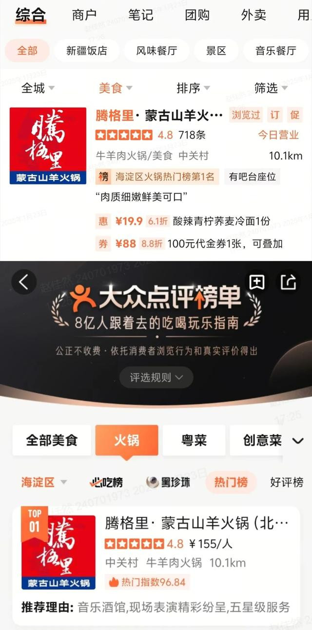 西贝旗下品牌“腾格里”悄悄登上“海淀区火锅热门榜第一名”。